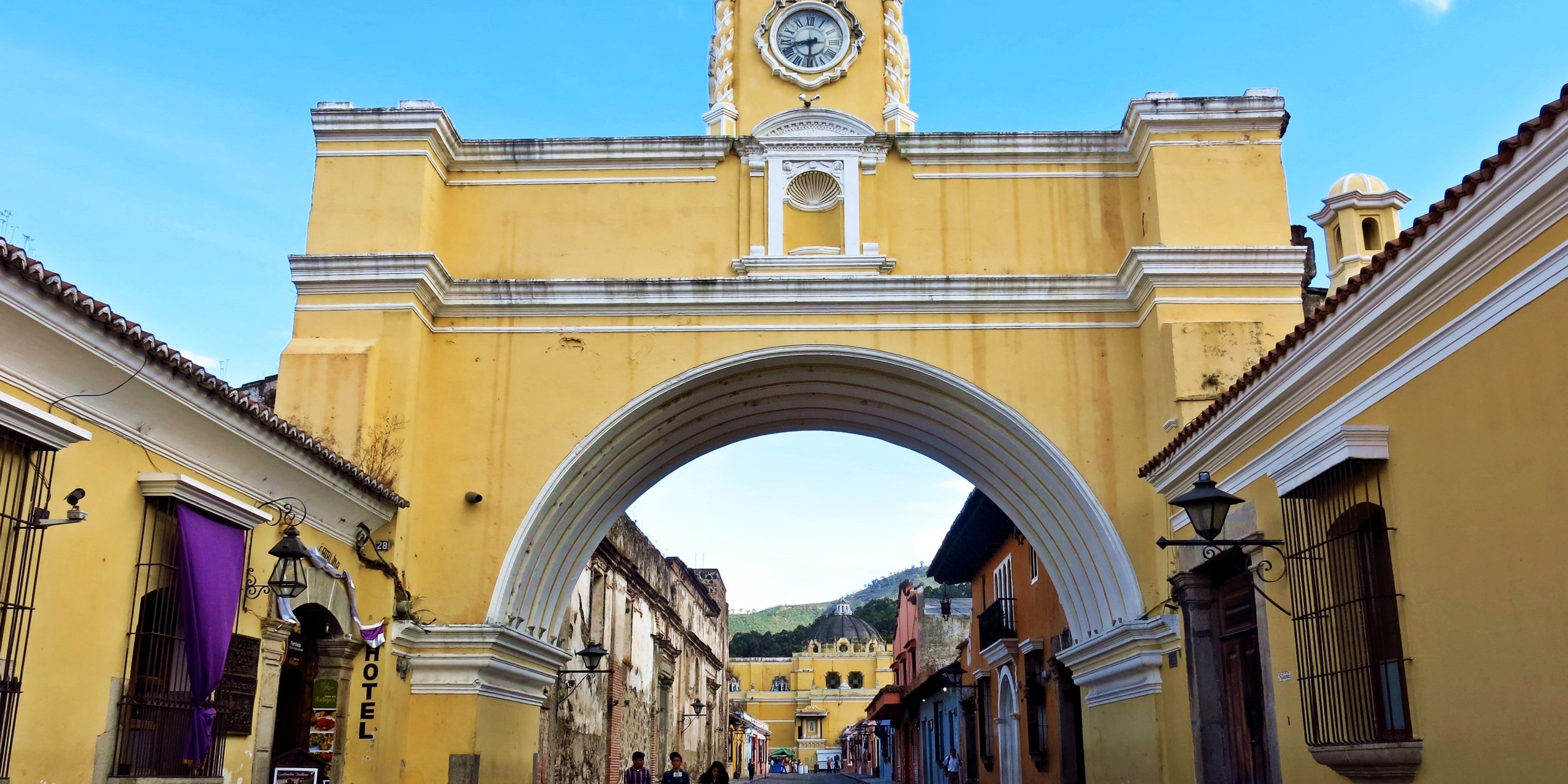 Si por el Parque Central se pasará unas cuantas veces, por aquí no será menos. Quizás es la imagen más icónica de Antigua, con el volcán de Agua al fondo presente en casi todos los souvenirs. No es difícil imaginarse el gran riesgo que ha tenido Antigua al ver la cercanía de este volcán junto con el volcán Fuego y el Acatenango que tampoco se encuentran muy lejos. Así es como los terremotos provocados por estos tres colosos han conseguido derribar media ciudad en incontables ocasiones. Esta especie de puente elevado con su torre reloj, servía a las monjas para pasar al anexo Convento de Santa Catalina. Se sitúa en la 5ª Avenida norte, cerca de la Merced.